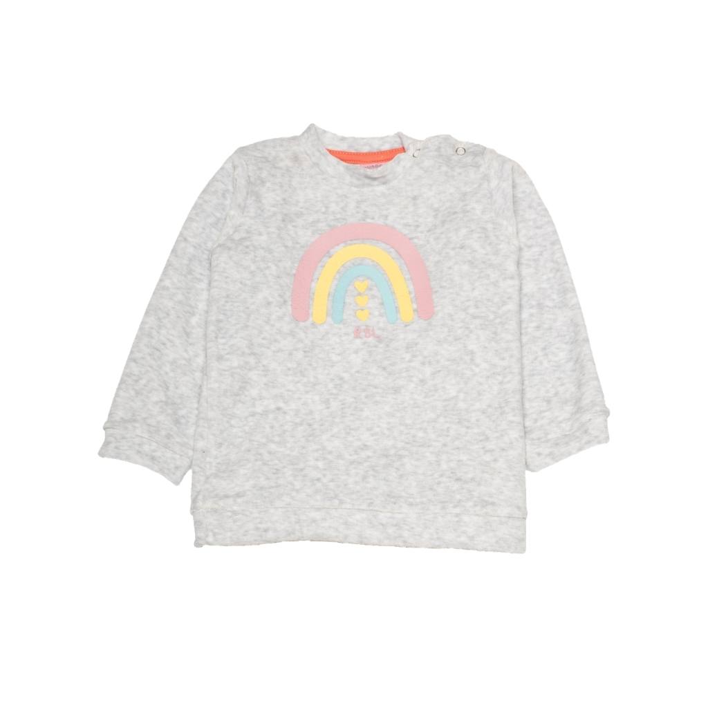 El buzo blanco destaca por su delicada estampa de arcoíris en tonos pasteles, mientras que el pantalón en azul profundo ofrece un contraste moderno y práctico para el uso diario.