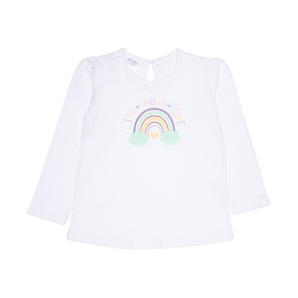 Se destaca por su estampa central de arcoíris con corazones y la frase «Live, Laugh, Love», acompañada de unos sutiles volados en los hombros (manga princesa) que realzan el diseño.